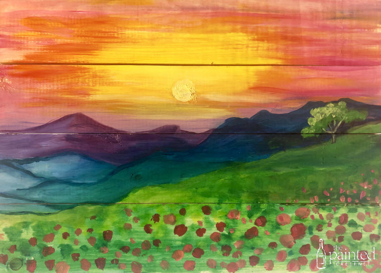 Wood Pallet Class - Mountain Sunset Paint on a pine wood pallet! Includes a glass of wine! 6:00pm